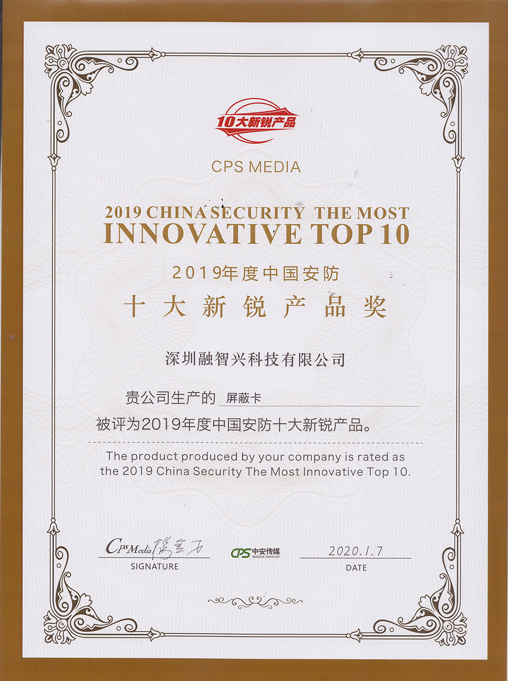 特此,中國安防行業(yè)領(lǐng)導(dǎo)者給我司研發(fā)的屏蔽卡頒發(fā)了“2019年度中國安防十大新銳產(chǎn)品獎(jiǎng)”,這不僅僅是融智興獲得又一項(xiàng)資格榮譽(yù),更是代表了安防行業(yè)對(duì)我司屏蔽卡產(chǎn)品的高度認(rèn)可。